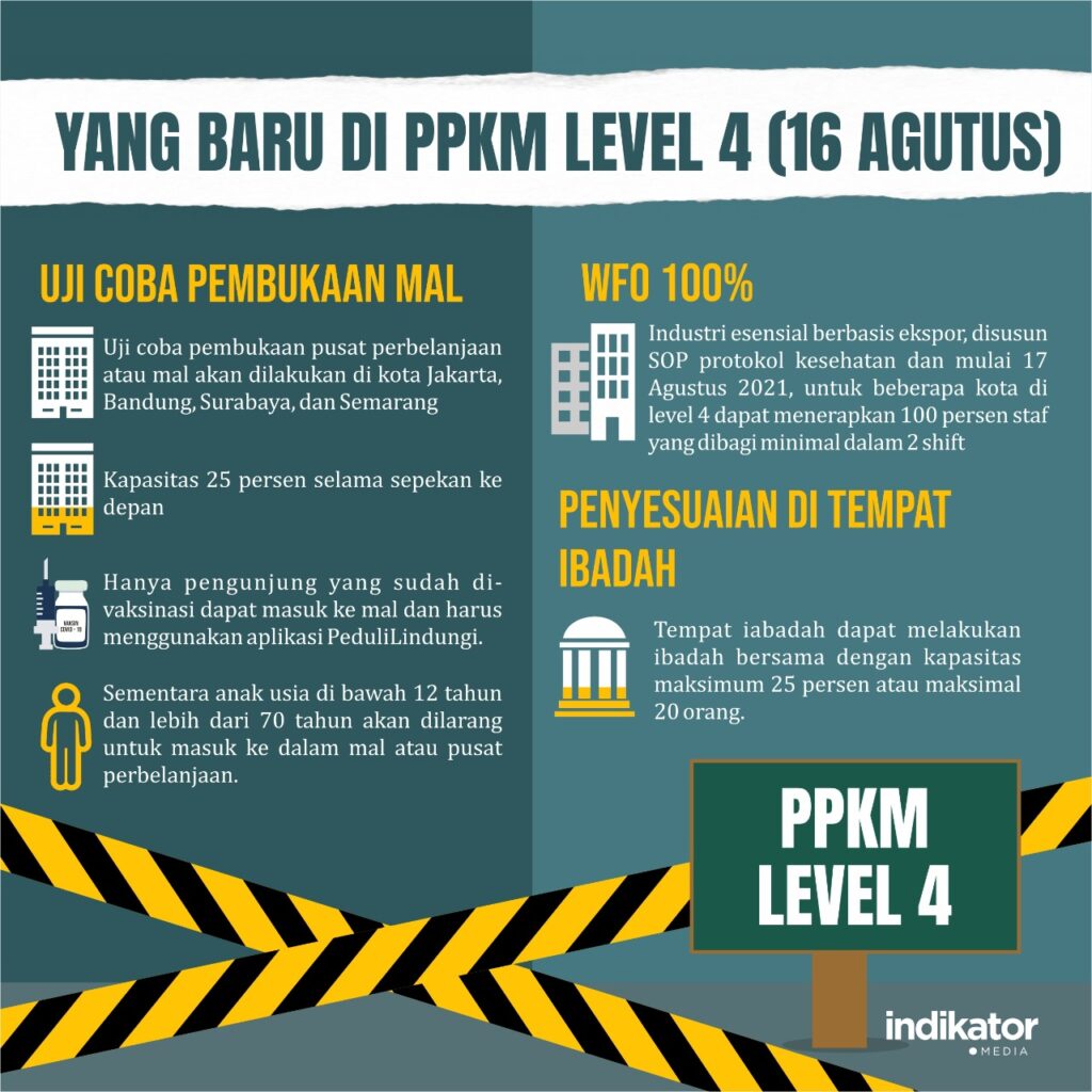Selain aturan baru terkait dibukanya kembali mall atau pusat perbelanjaan modern ini, juga ada aturan baru terkait sektor esensial dapat melakukan WFO atau work from office 100 persen, dengan catatan protokol kesehatan dilaksanakan secara ketat dan pemberlakuan 2 shift jam kerja.