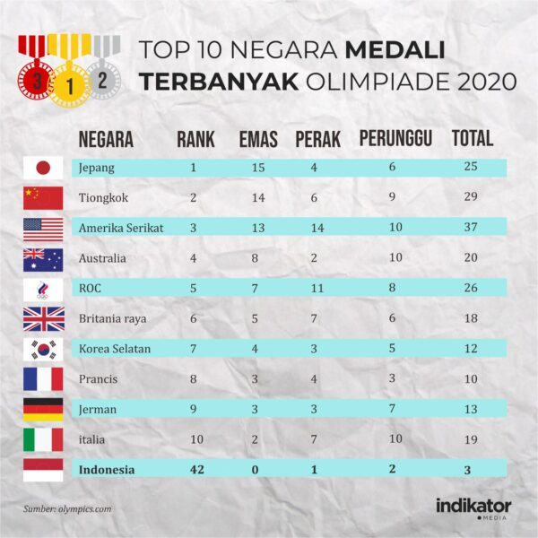 Sementara para atlet Indonesia pun berjuang habis habisan untuk mengumpulkan medali. Namun sayangnya, perolehan medali Indonesia masih terlampau jauh dibandingkan para jawara di atasnya. Indonesia baru mengumpulkan 1 perak dan 2 perunggu. Perolehan ini menempatkan Indonesia di peringkat 42. Padahal Ketua Komite Olimpiade Indinesia (KOI) Radja Sapta Oktohari telah menargetkan peringkat Indonesia di angka 40, setelah pada Olimpiade 2016 lalu, Indonesia berada pada posisi 46.