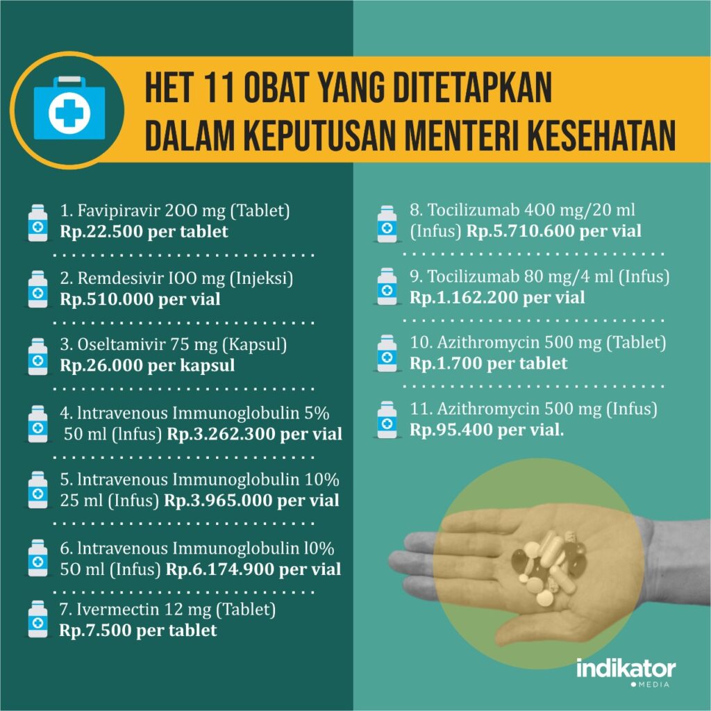 JAKARTA (Indikator) – Agar tidak terjadi lonjakan harga obat obatan jauh di atas harga normal, pemerintah menetapkan harga eceran tertinggi (HET) untuk sejumlah obat yang paling diburu masyarakat, khususnya di masa pandemic covid 19 ini. Mulai dari jenis obat antivirus seperti Favipiravir, Remdesivir, Oseltamivir, serta Azitromycin, hingga aneka obat untuk meningkatkan antibodi, seperti Intravenous Immunoglobulin, Ivermectin, dan Tocilizumab.