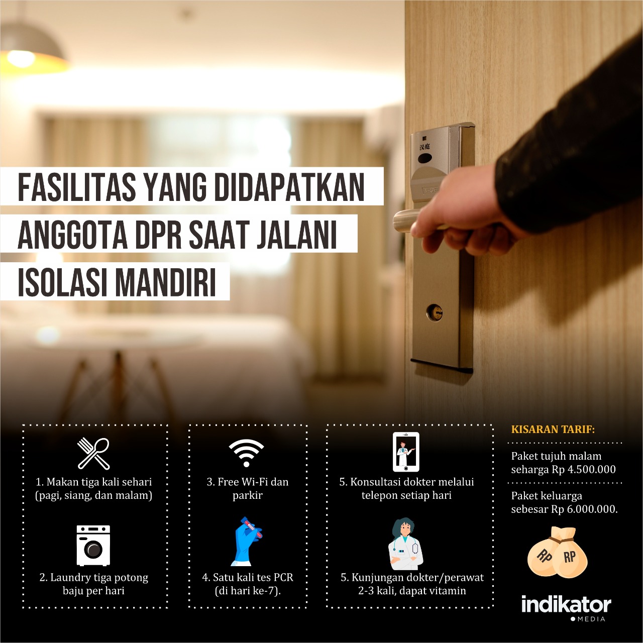 Fasilitas tersebut mulai dari makan 3 kali sehari, laundry baju 3 potong sehari, free wifi dan parkir, tes PCR di hari ketujuh, konsultasi dokter melalui telepon setiap hari, hingga kunjungan dokter 2 hingga 3 kali, plus vitamin. Paket Isoman yang bisa didapat anggota dewan senilai Rp 4,5 juta untuk 7 malam. Sementara paket isoman sekeluarga senilai Rp 6 juta.
