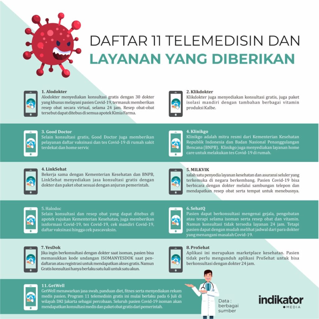 Berikut ini adalah daftar 11 telemedisin dan jenis layanan yang diberikan, dihimpun dari berbagai sumber.