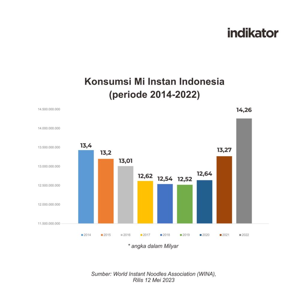 Berdasarkan data World Instant Noodles Association, konsumsi mi instan Indonesia mencapai 14,26 miliar porsi/bungkus pada 2022. Jumlah ini meningkat 7,46% dibandingkan tahun sebelumnya (year-on-year/yoy) sebanyak 13,27 miliar bungkus.