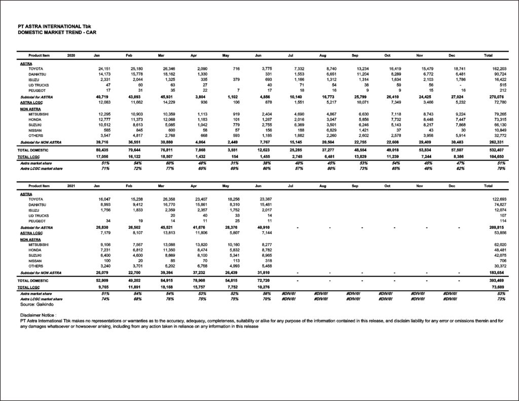 Sementara Head of Corporate Communications Astra Boy Kelana Soebroto, mengatakan, kenaikan penjualan mobil di tingkat wholesales pada bulan Juni 2021 dibandingkan dengan penjualan bulan sebelumnya lebih dipengaruhi oleh penambahan jumlah supply ke diler.